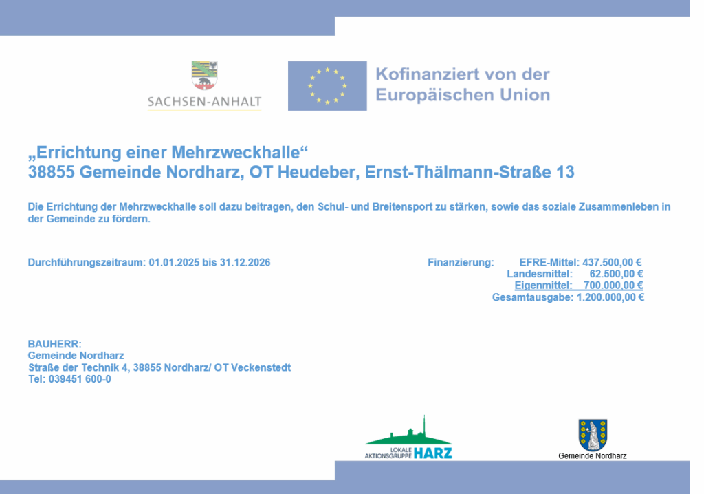 Ende Mai 2025 trafen sich Bürgermeister Gerald Fröhlich, Ortsbürgermeisterin Anja Meyer und Ex-Ortsbürgermeister Hartmut Busch mit Vertretern der Baufirmen sowie dem Planungsbüro. Mit einem symbolischen Spatenstich gaben sie den Startschuss für die zukünftige Sportstätte. Die Halle in Größe und Höhe eines Volleyballfeldes (17,5 m x 13 m) soll hauptsächlich von den Vereinen des Dorfes, sowie für den Schulsport und einzelne Veranstaltungen genutzt werden. Die Gesamtkosten des Bauvorhabens belaufen sich auf ca. 1,2 Mio. €. Wir freuen uns, über die finanzielle Unterstützung aus den EFRE-Fördermitteln in Höhe von 437.500,00 € sowie aus dem Förderfonds der LEADER-Harz e.V. in Höhe von 62.500,00 €.